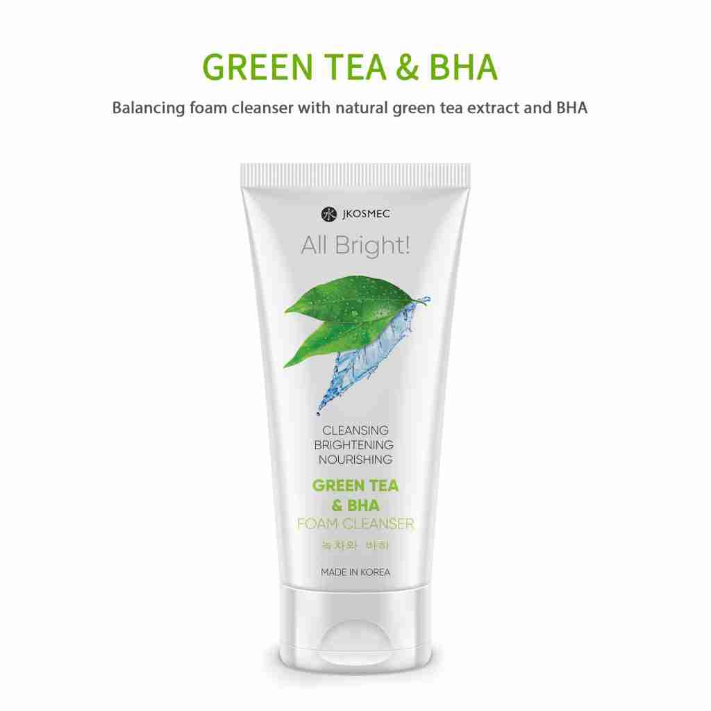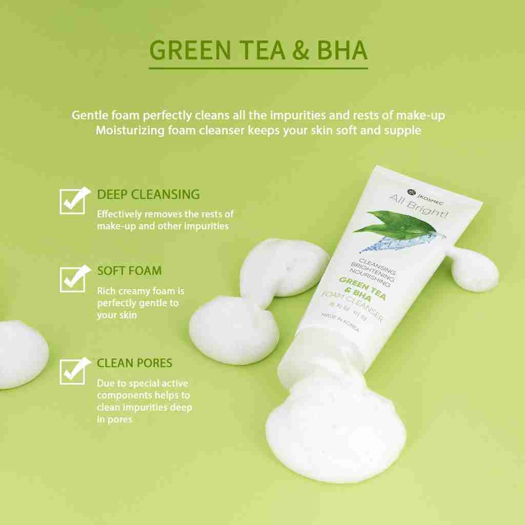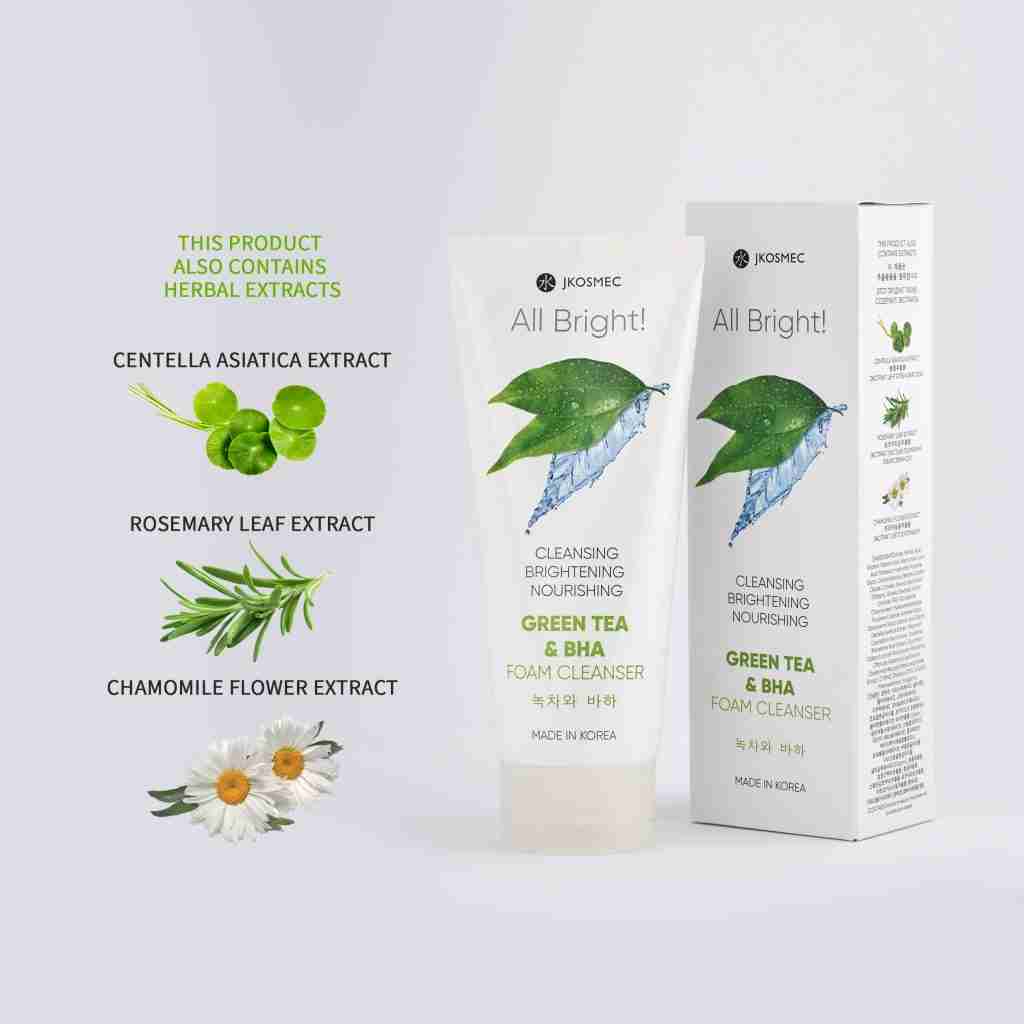 JKosmec All Bright Green Tea and BHA Foam Cleanser enthält natürlichen Grüntee-Extrakt und BHA, die Ihre Haut hell und strahlend machen. Grüntee-Extrakt ist ein hautfreundlicher Inhaltsstoff, der viele Mikroelemente enthält, um Ihre Haut mit Feuchtigkeit zu versorgen und eine besondere Schutzbarriere für Ihre Haut zu schaffen. Grüntee-Extrakt spendet Feuchtigkeit, verbessert den Hautton, macht Ihre Haut sauber und strahlend. BHA macht sanft und sicher weich und entfernt abgestorbene Hautzellen, um eine tiefere und effektivere Reinigung zu fördern.
