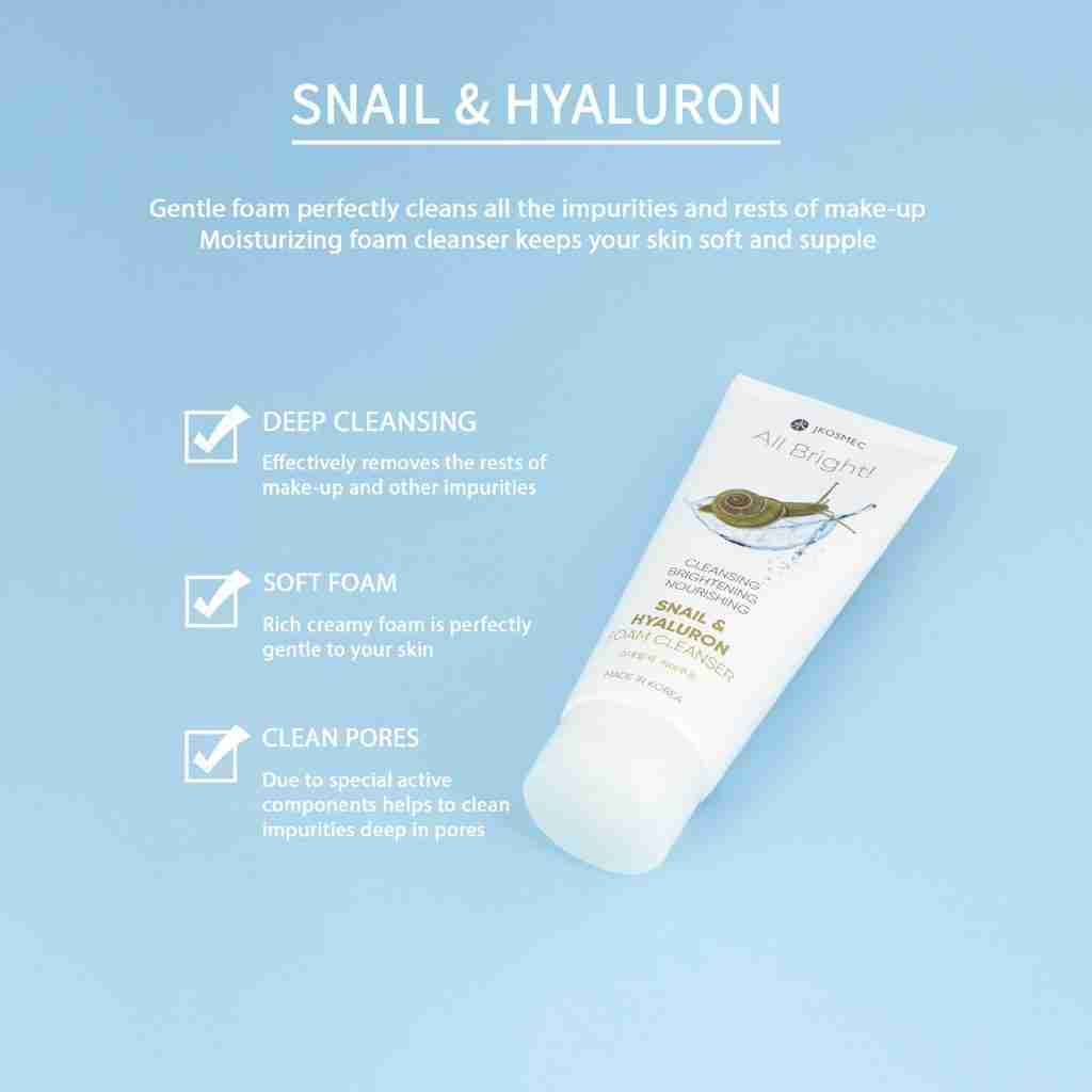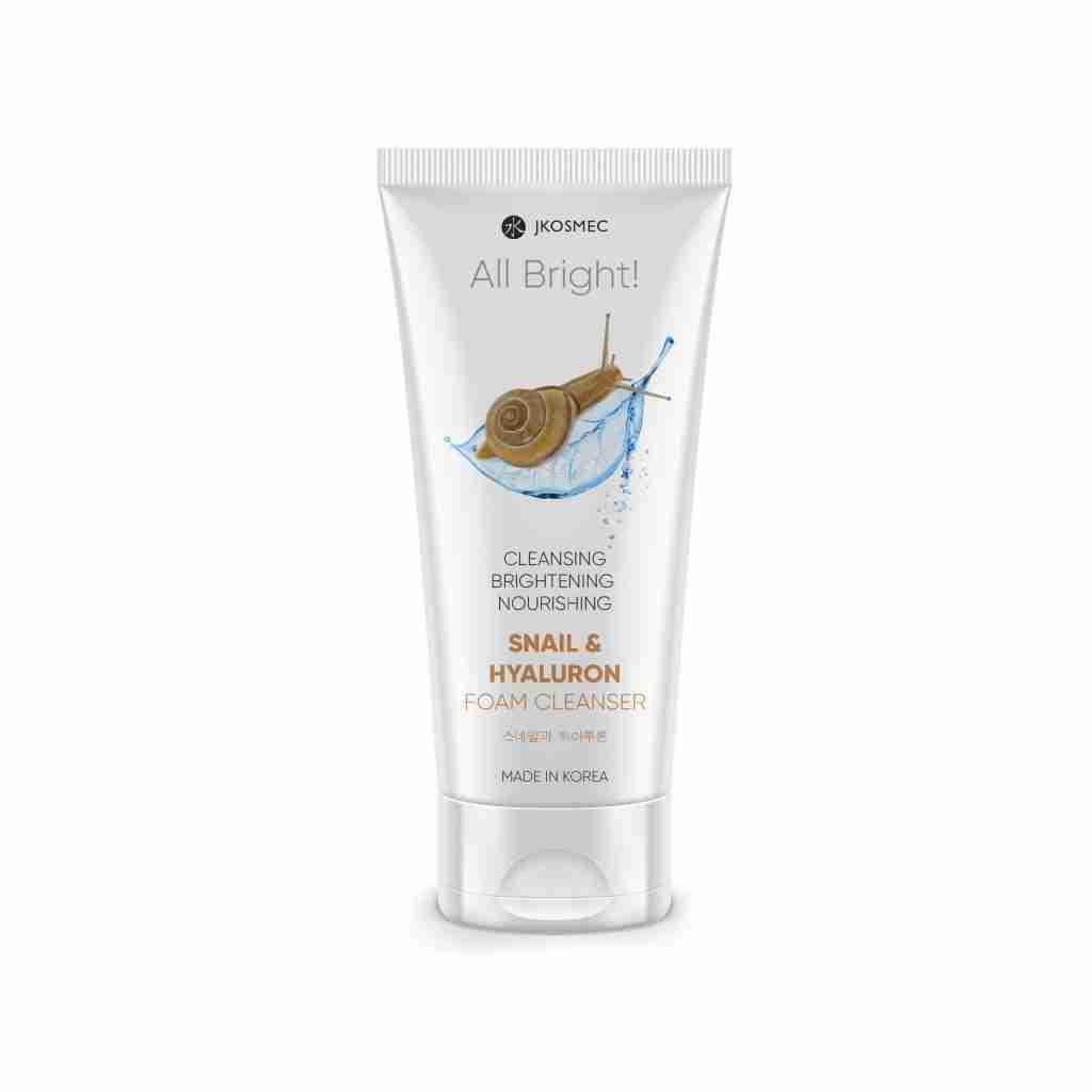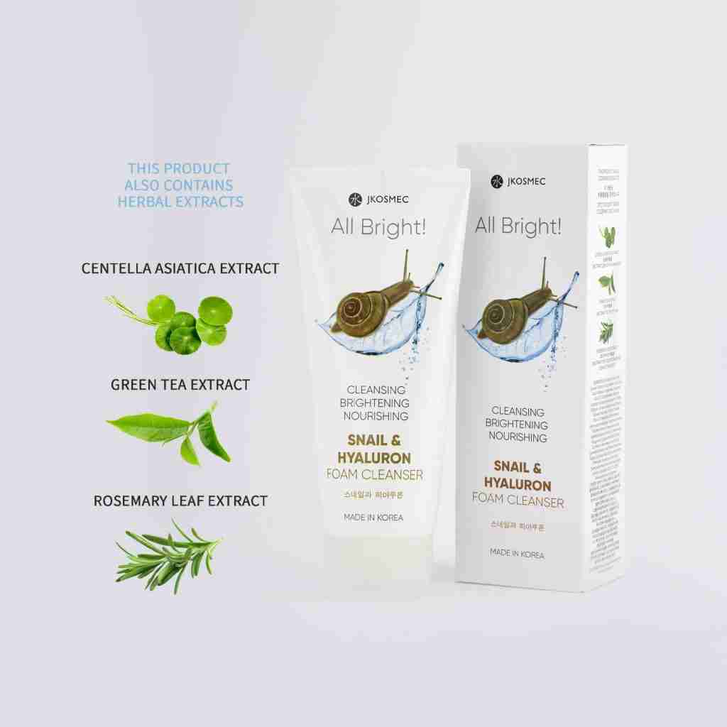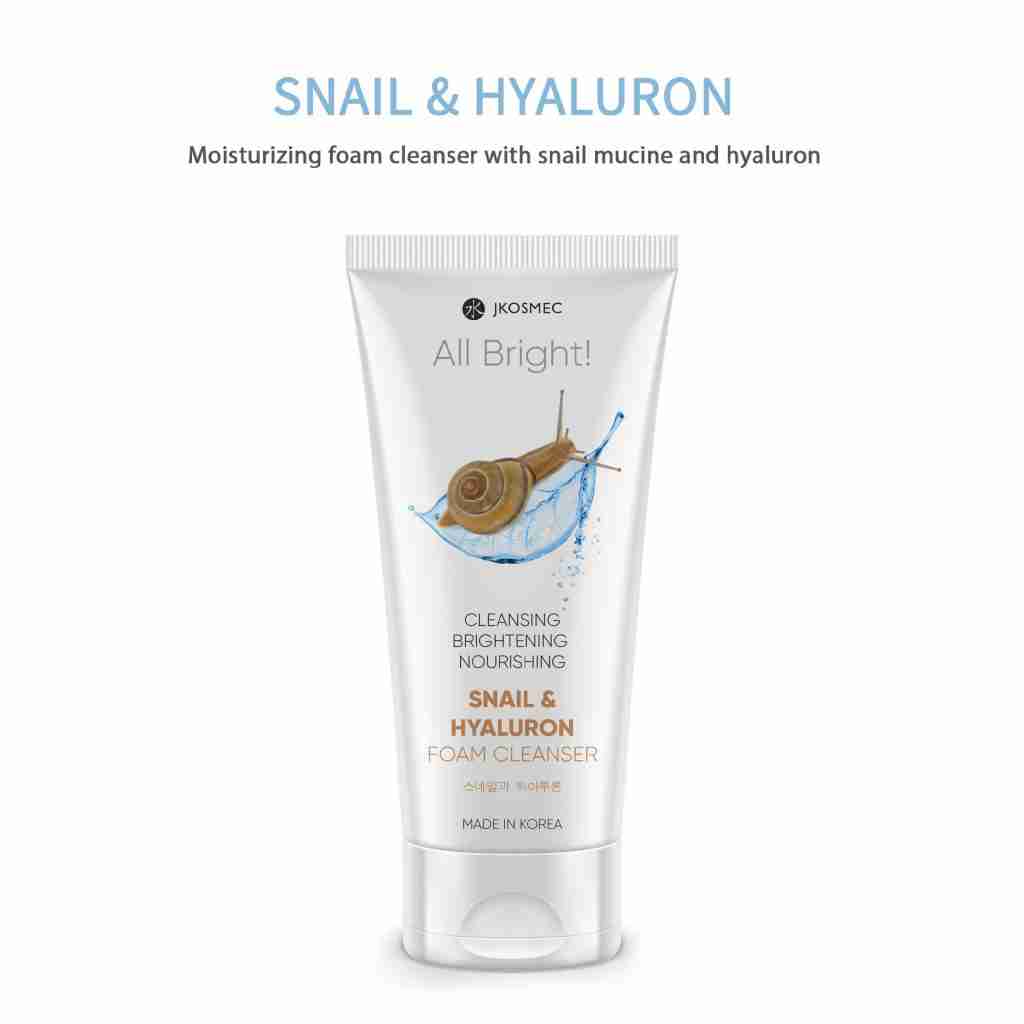 Το JKosmec All Bright Snail and Hyaluron Foam Cleanser περιέχει βλέννα σαλιγκαριού και υαλουρονικό, που ενυδατώνουν και αποκαθιστούν τέλεια τη φυσική λάμψη της επιδερμίδας σας, καθαρίζει όλους τους ρύπους και τα υπόλοιπα του μακιγιάζ. Ο ενυδατικός αφρός καθαρισμού διατηρεί το δέρμα σας απαλό και ελαστικό.
